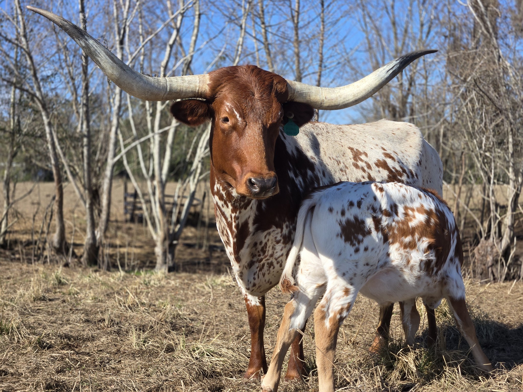 A young red and white cow who raises a large healthy calf.