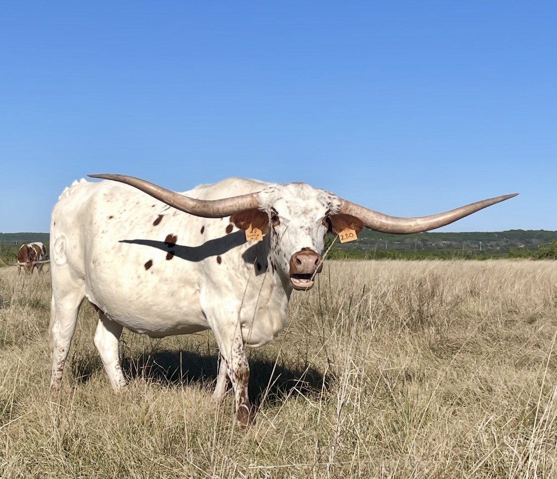 Bentwood has a young maternal sister of this cow out of Night Watch that is over 90". A longhorn consultant has told me they have great stuff out of this maternal line and I believe it with what I'm seeing so far. Her 2024 heifer out of Electra Texa is one of our best built animals on our farm with great horn. Her 2025 flashy heifer with it all out of RJF Black Magic we have consigned to the 2026 Texas Treasure Sale. For just still being a 4 yr old she has really great body size and a beautiful backward roll to her horns of which I think it later on in years will have great TTT. I think she could be a little better on her top line but speaking with others on this topic some actually like a little dip in the back. Either way we're extremely happy with her kiddos and looking forward to all her other ones.