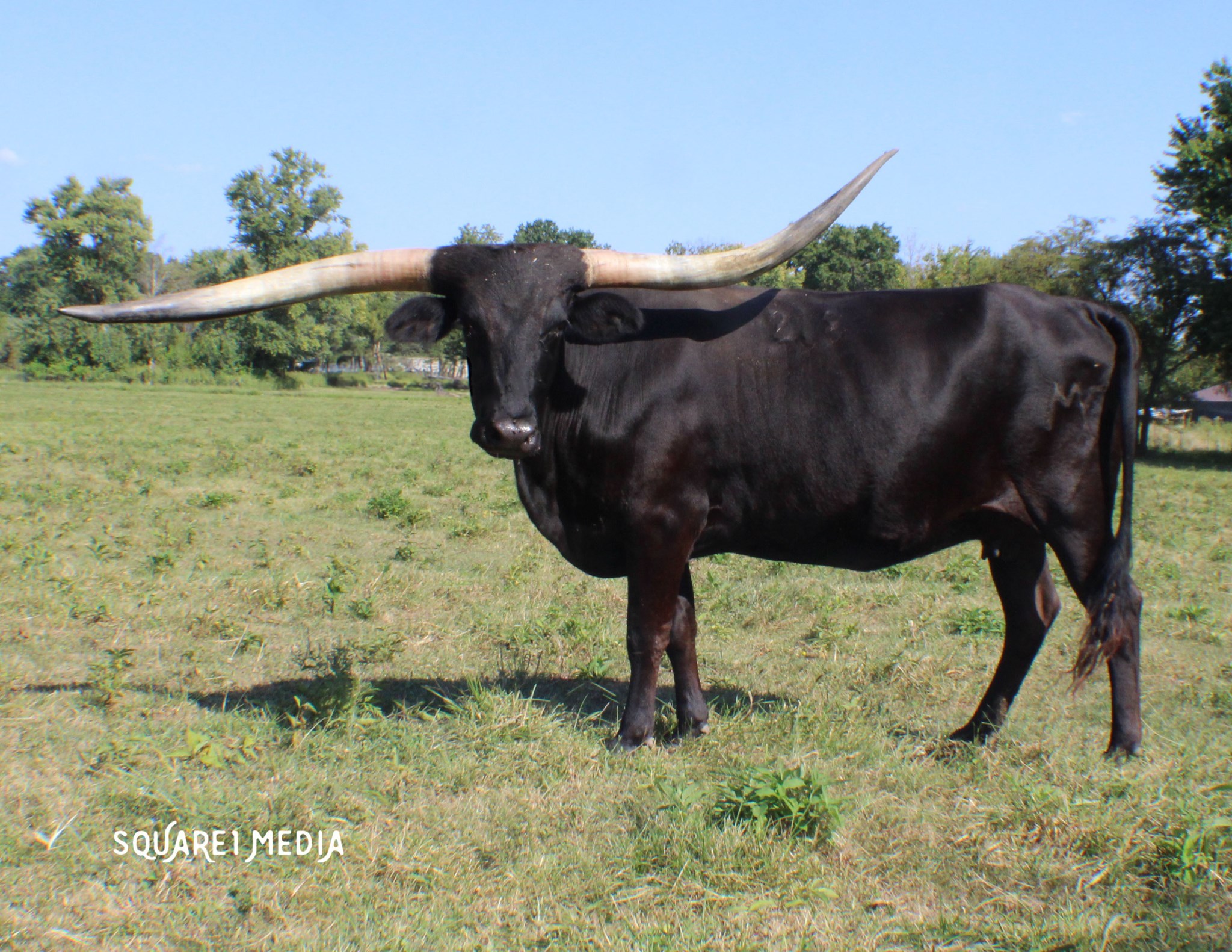 Solid black with over 80" of horn. Solid pedigree also.