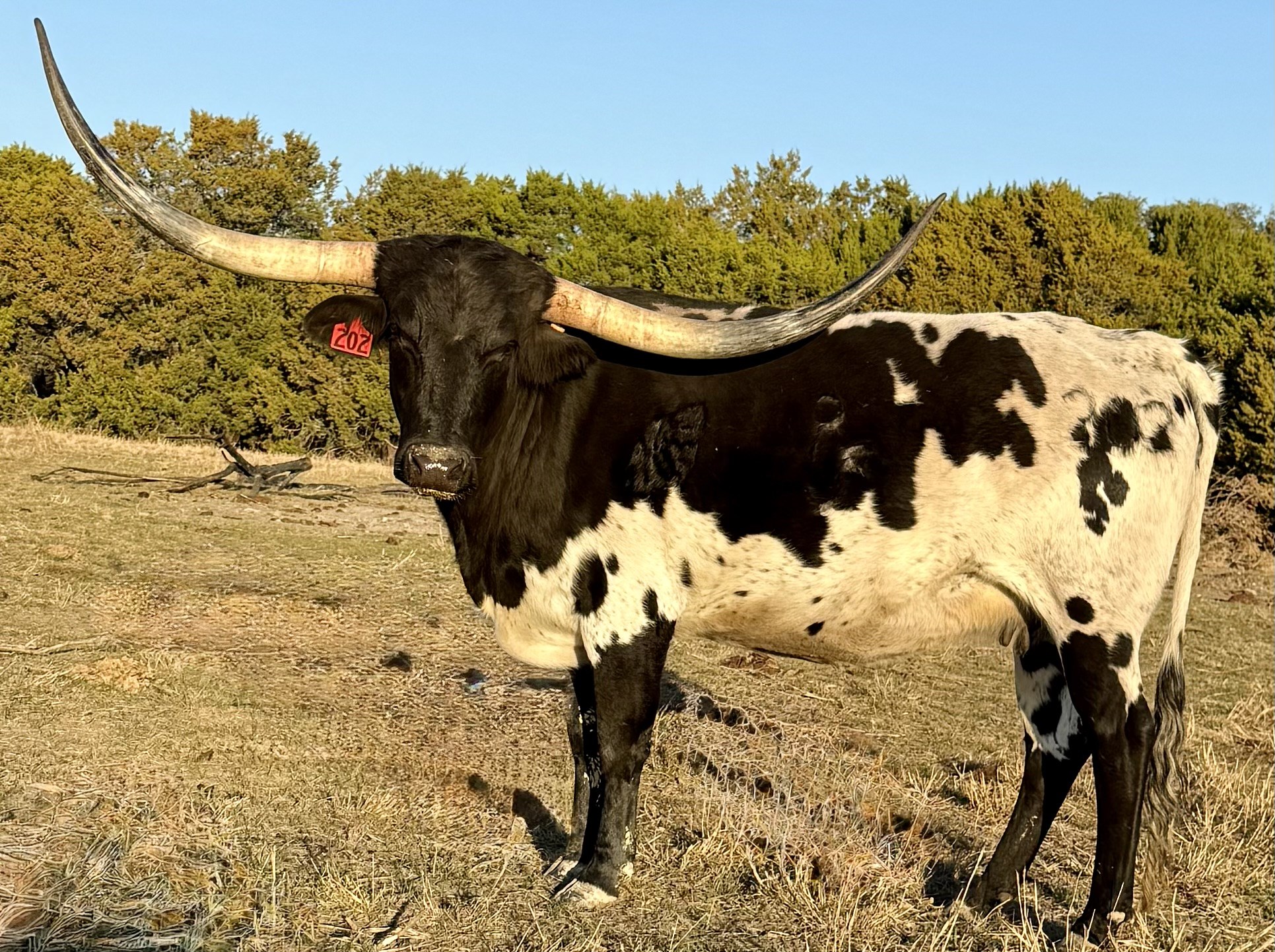 Out of Rural Safari Son, a true black, who is over 90" TTT. Add black and white multi-generation genetics, plus explosive horn from her 100"TTT dam with spot-on conformation and you've got Lovie! Strong maternat line: Bet I Can/Rio Can Can!! Complete package!! End of story!!