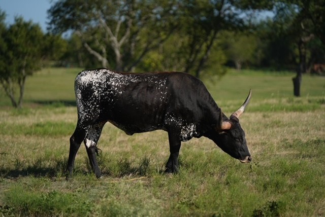 Meet 20 Tulips, a bold Texas Longhorn with a sleek black coat speckled with white across her back and hindquarters. Her gracefully curved horns extend outward, showcasing the iconic Longhorn look. Her dark face, accented by bright, alert eyes, gives her a regal and confident presence. Sire is award winning Hubbells 20 Gauge!!