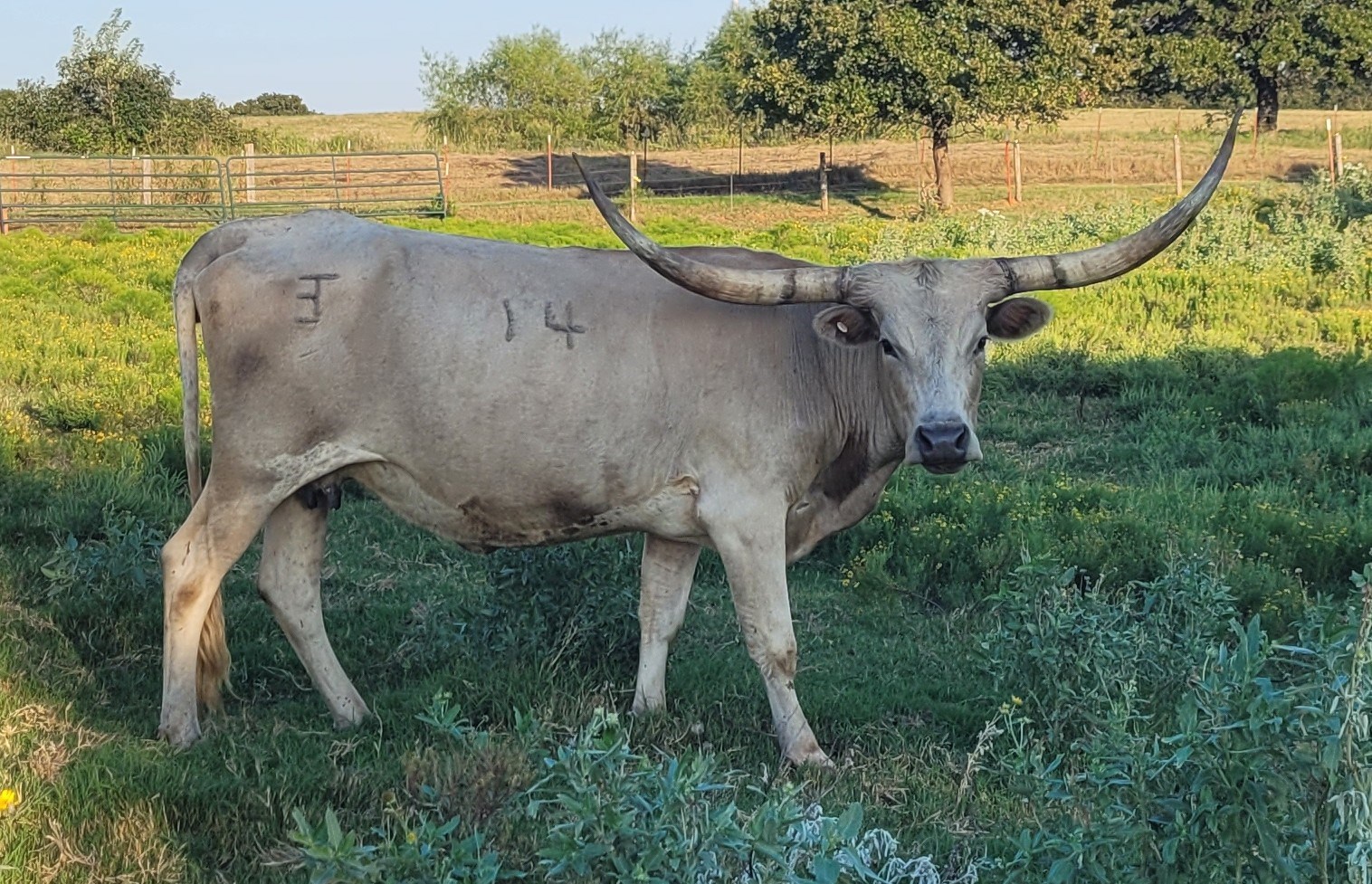 Young Grulla cow with 18 or more 80+ inch Tip-To-Tip animals in her exceptional pedigree. Calm and gentle, no indication that her name was somehow earned! We like Grulla. EOT Branded.