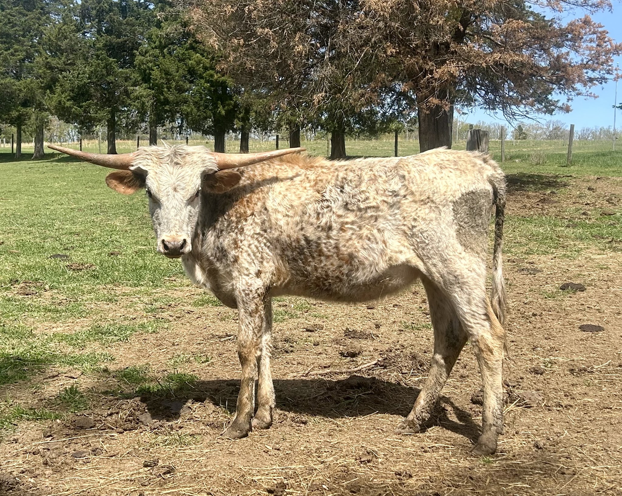 We have been waiting to do this breeding for a while now and here she is! I am very impressed as to how she is developing. She is red roan just like her dam, except he has started getting some blue coming into her coat. She has a really cool horn set that are starting to crank back with a nice lateral twist. I definitely think she will have the nicer horn set out of her two half-sisters.