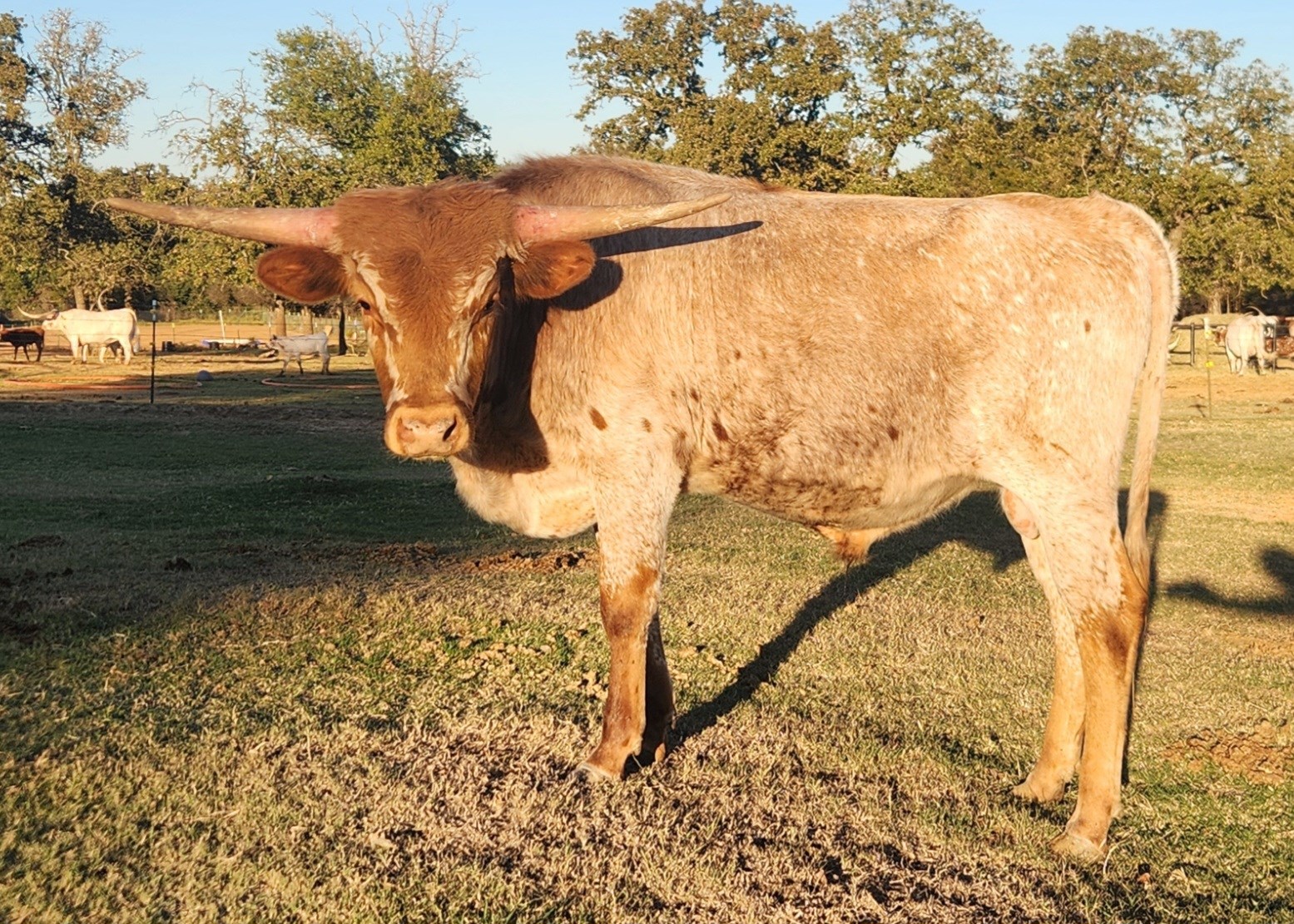 We lost Steve's mom to a freak accident when he was just 4 mo old, so he grew up with our show cows. Steve has a great start on a set of tight twist horns and we are excited to saddle break him as he gets a little older.