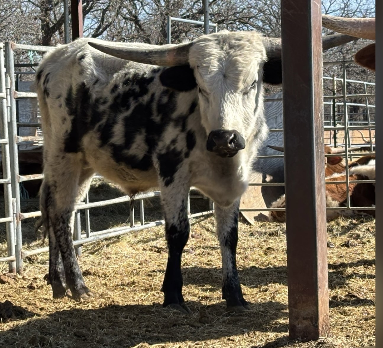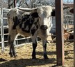 White with black spots. Big, flashy bull prospect.