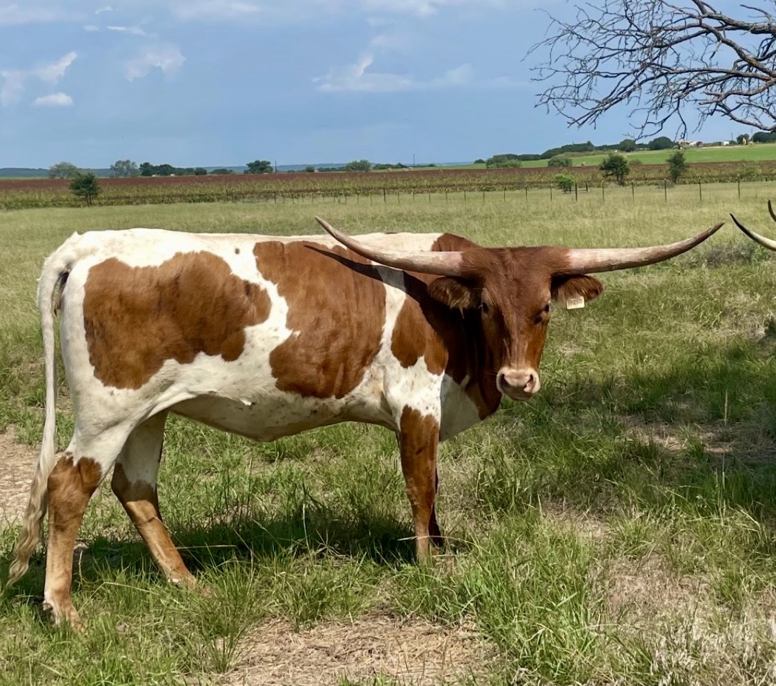 This amazing heifer is probably one of our best built animals on the farm. She was tracking to be around 60" or more at 2 yrs old even with the vertical horn but we didn't measure her then...we will do that in the spring of 2026. We truly believe she is going to be an amazing female for us. Her 2024 sister out of her mother we have consigned to the Texas Treasure Sale that is truly a knockout. She is easy going and some dark stripes is starting to brindle on her. Can't wait to see what she throws for us out of Goose cause we expect her to follow just in line with her awesome maternal line.