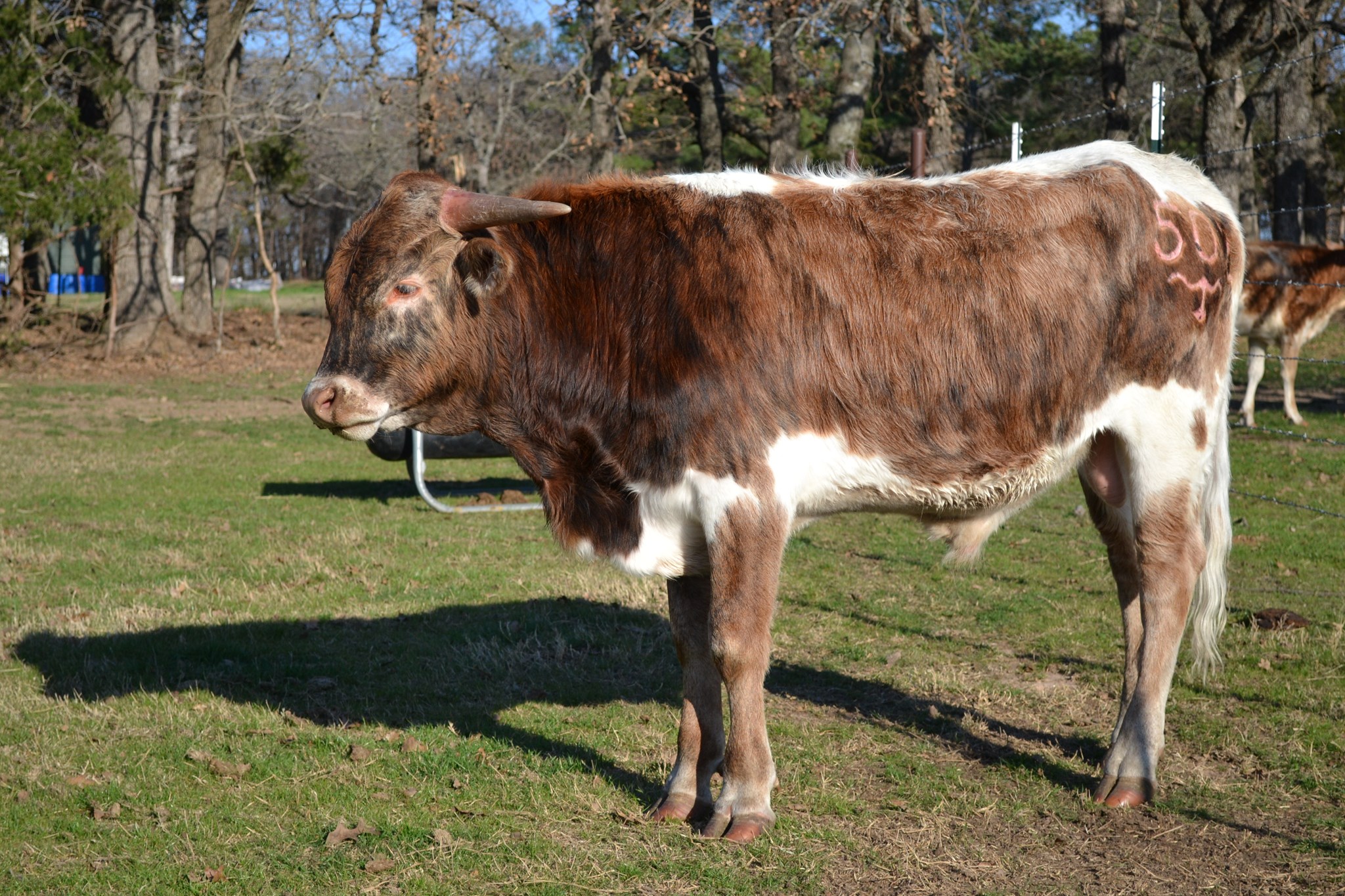 Look at the size on this boy! He is starting to brindle dark gray on his blonde outer coat. WE love going out every day and seeing his color change and how much size he is putting on. Check out his pedigree- he has 1 over 100", 3 over 90" and 5 over 80" along with multiple bronze winners in his pedigree. We have been looking for a solid future herd sire--could this be the one??