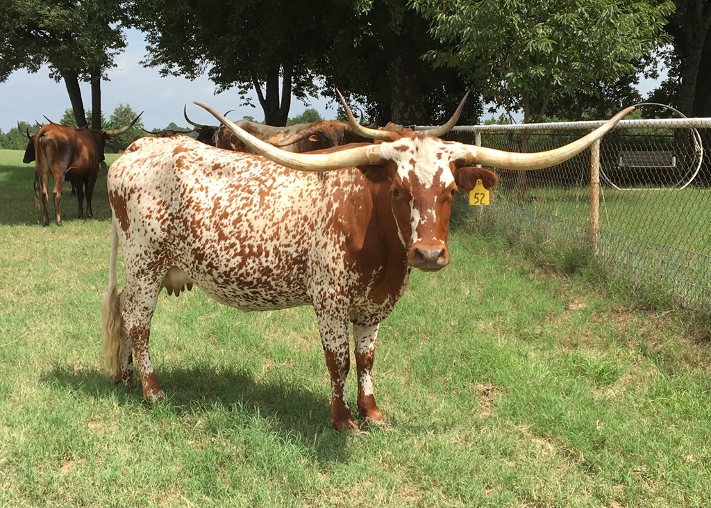 Gorgeous red and white roan, with lacy face! Gently curving horns and great conformation!! Sired by ZD Kelly over 83" TTT!! From Ron and Barbara Marquess' world-class breeding program!!