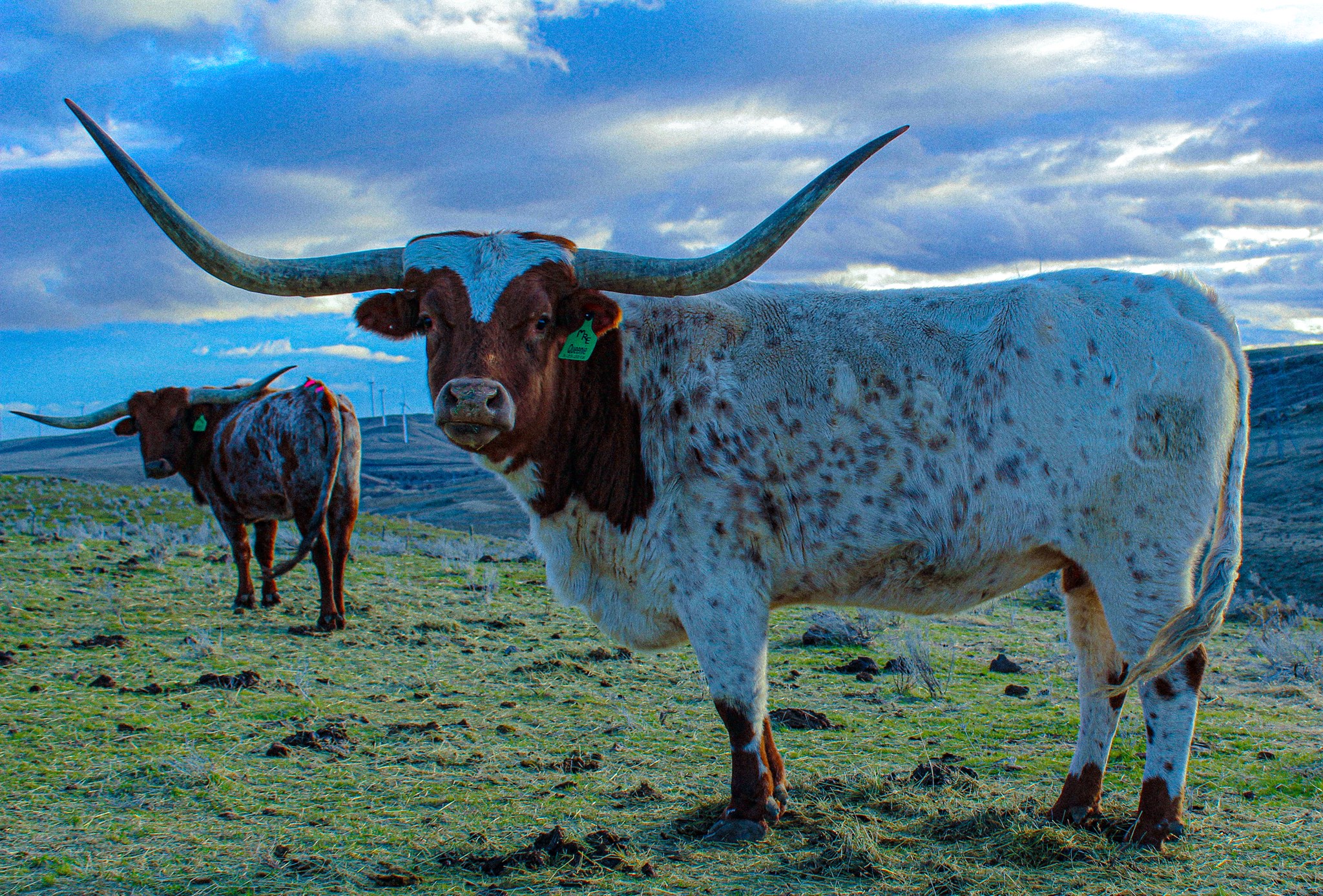 Queenie is our first longhorn cow, we purchased. Some great foundation bloodlines four our herd. She comes from a CR Longhorn bull, and a Fey Longhorn cow. Two great breeders out of Oregon.