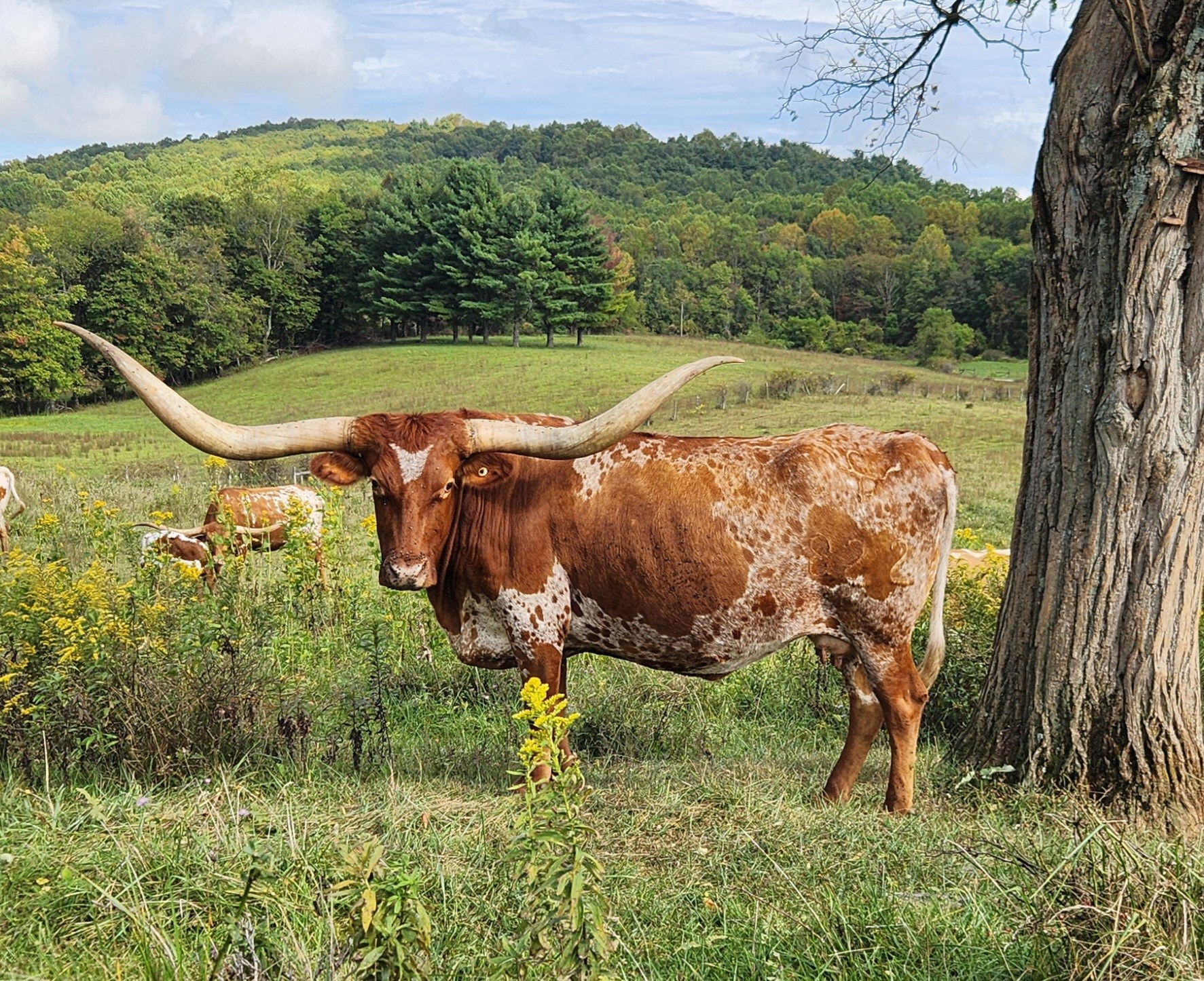 Boomerang is one of the most gentle cows we've ever owned. Not only is she a great mother, but she is blessed with great horn which is predicted to the mid-80's. She is insanely smart, workable, and always in the mood for some hand-fed cubes! She is currently bred to Goldmine 1 for a late season '23 calf.